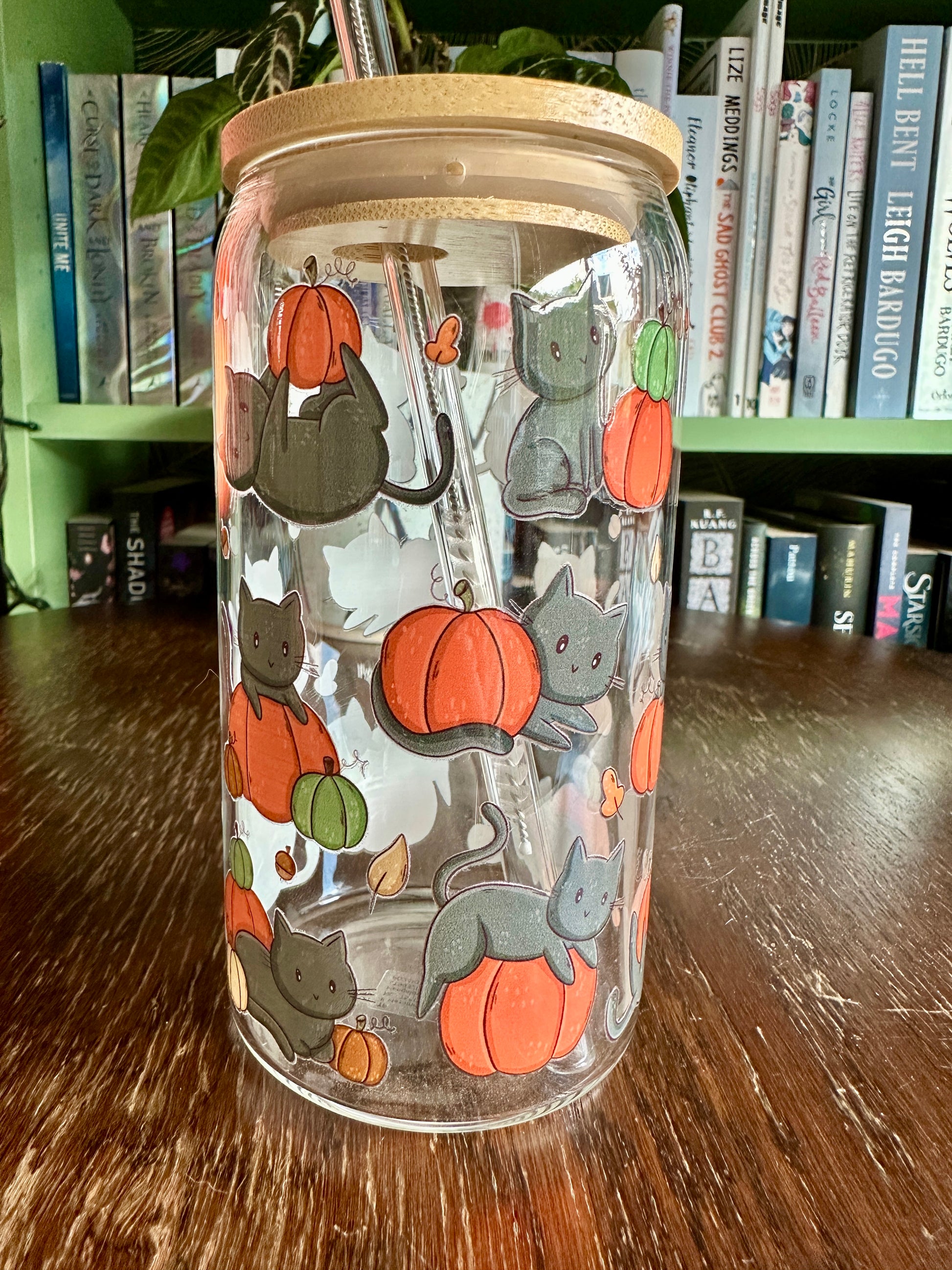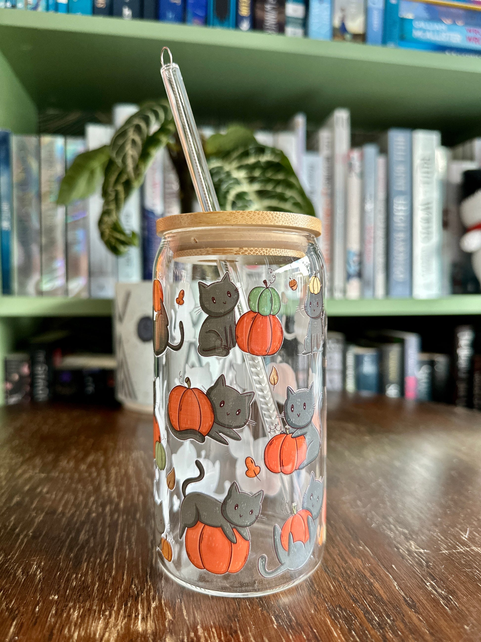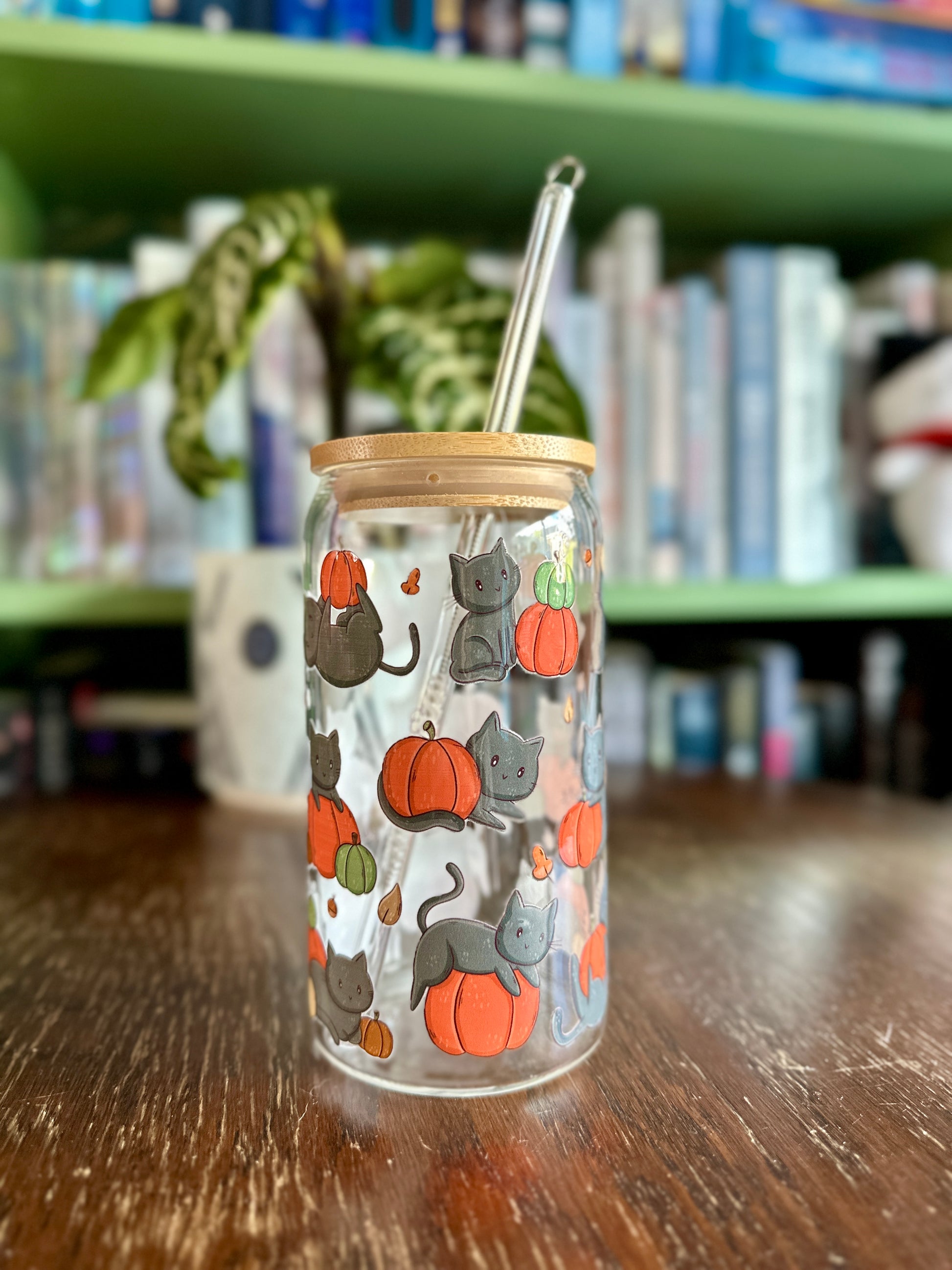 Schwarze Katzen und Kürbisse Glasbecher