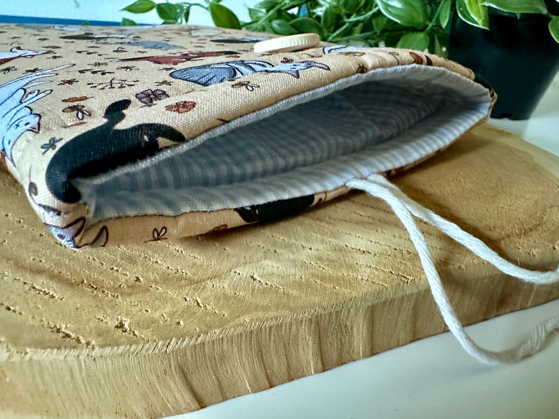 Da alle Hüllen handgefertigt sind, können einige Teile empfindlicher sein als andere Produkte. Wir haften nicht für vom Benutzer verursachte Schäden an Hülle, Knopf oder Schnur.
