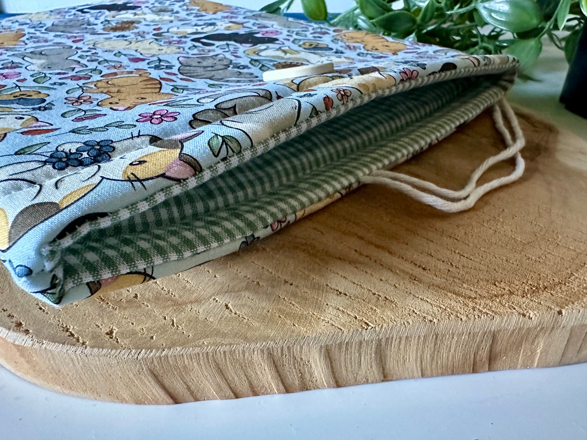 Toutes les pochettes étant fabriquées à la main, certaines pièces peuvent être plus fragiles que d'autres produits. Nous déclinons toute responsabilité en cas de dommage causé par l'utilisateur à la pochette, au bouton ou au cordon.