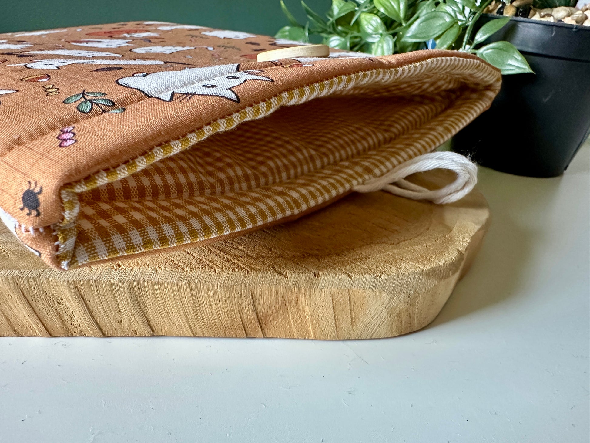 Toutes les pochettes étant fabriquées à la main, certaines pièces peuvent être plus fragiles que d'autres produits. Nous déclinons toute responsabilité en cas de dommage causé par l'utilisateur à la pochette, au bouton ou au cordon.