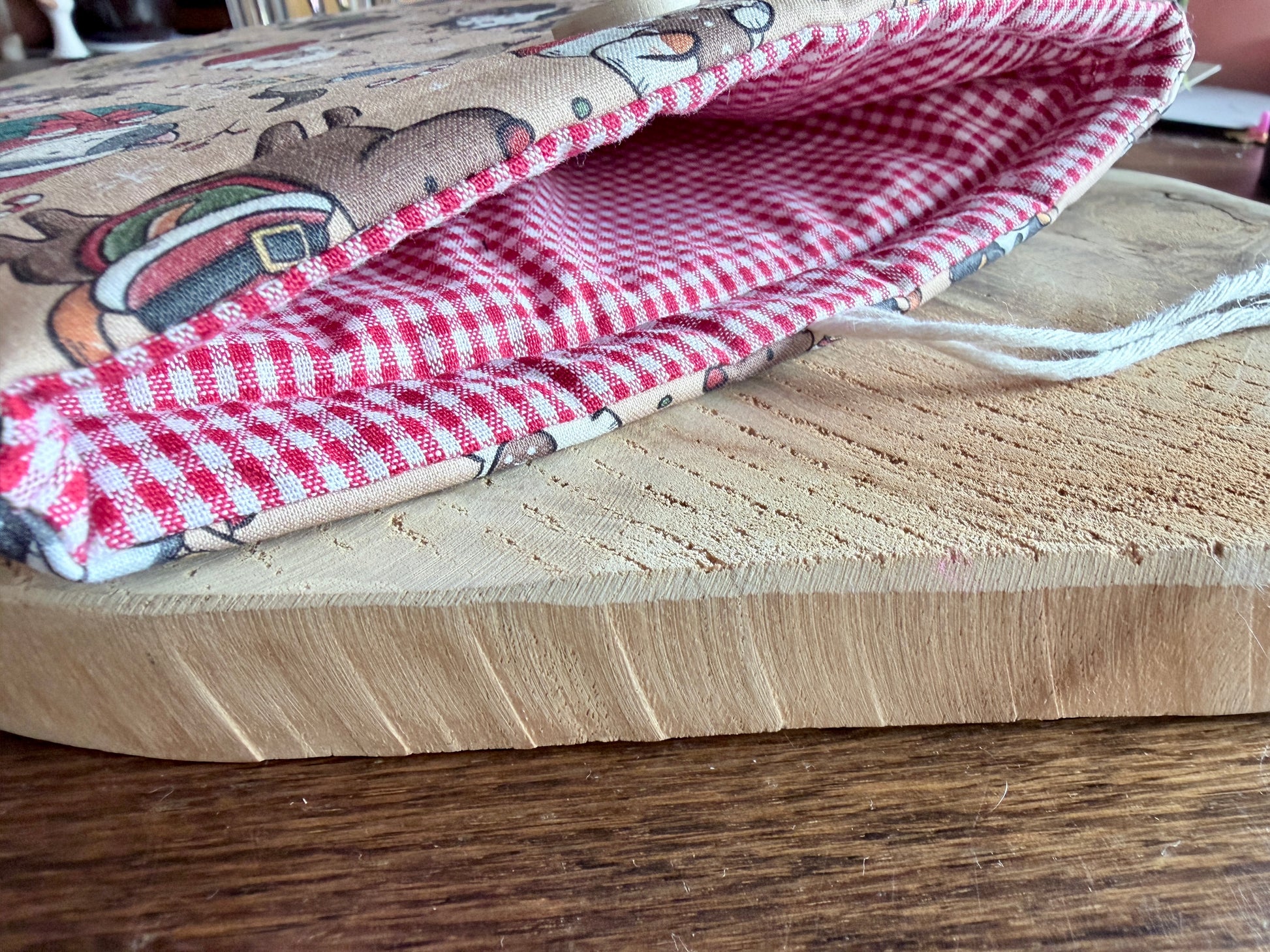 Toutes les pochettes étant fabriquées à la main, certaines pièces peuvent être plus fragiles que d'autres produits. Nous déclinons toute responsabilité en cas de dommage causé par l'utilisateur à la pochette, au bouton ou au cordon.