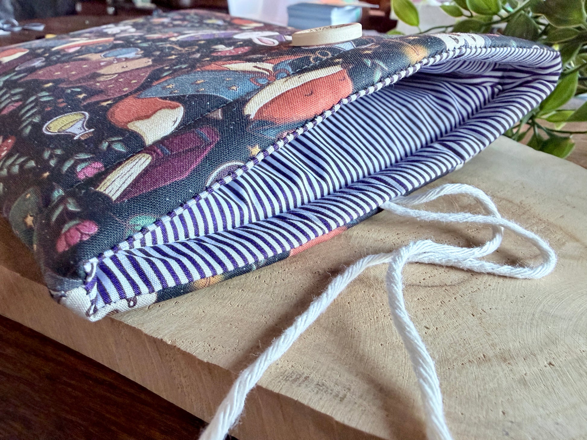 Toutes les pochettes étant fabriquées à la main, certaines pièces peuvent être plus fragiles que d'autres produits. Nous déclinons toute responsabilité en cas de dommage causé par l'utilisateur à la pochette, au bouton ou au cordon.